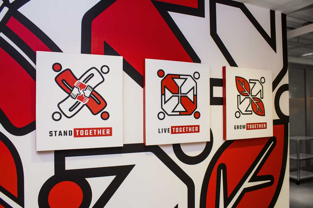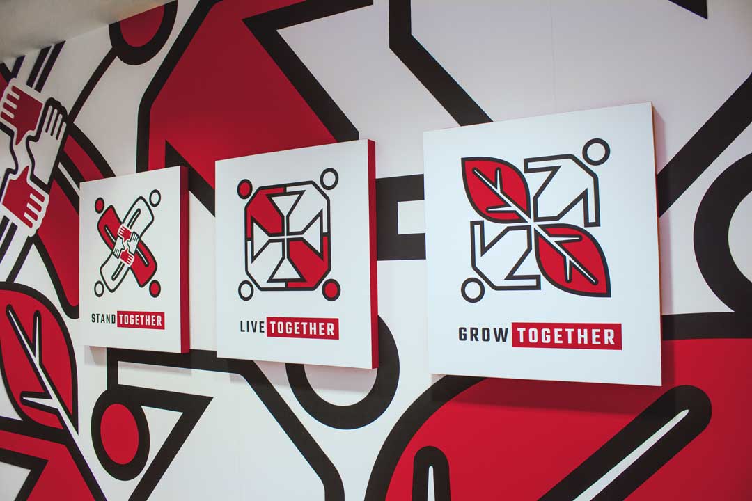 I developed three symmetric kaleidoscope-inspired icons that perfectly communicate the ideas of synergy and teamwork which are manifest in the STAND TOGETHER/LIVE TOGETHER/GROW TOGETHER axioms.