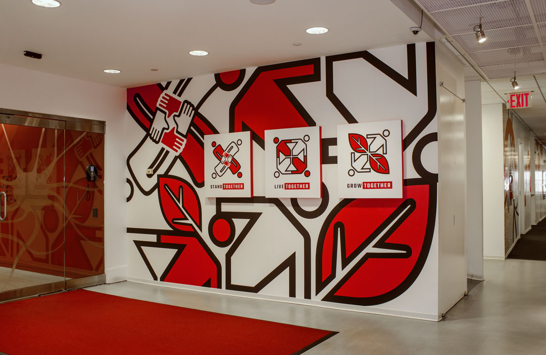 The icons were widely used in agency communications as well as a large wall that greeted employees and visitors in the main reception area. It featured three individual raised boxes for each value, placed over a composition of overlapping large-scale icons for maximum visual impact.