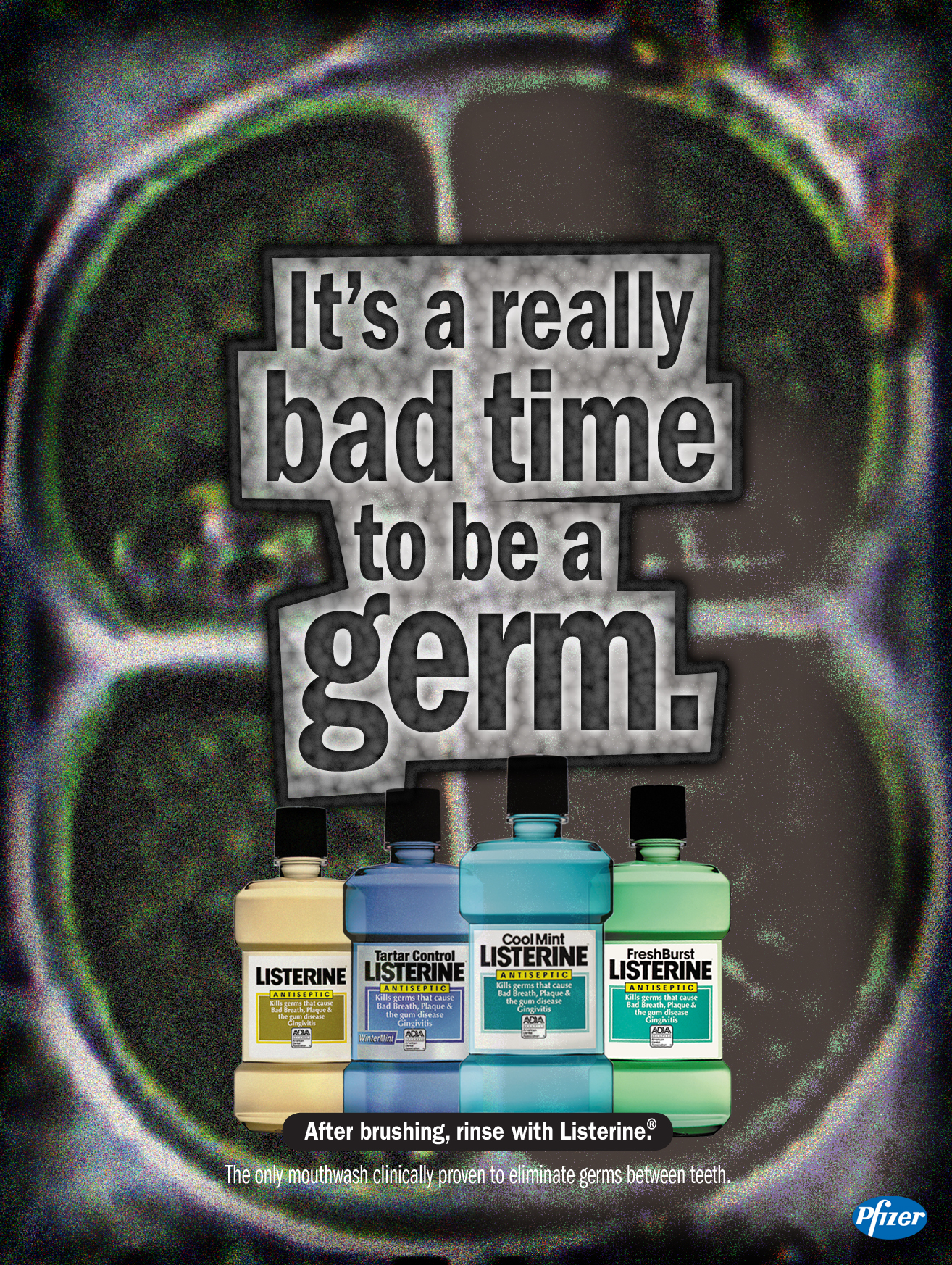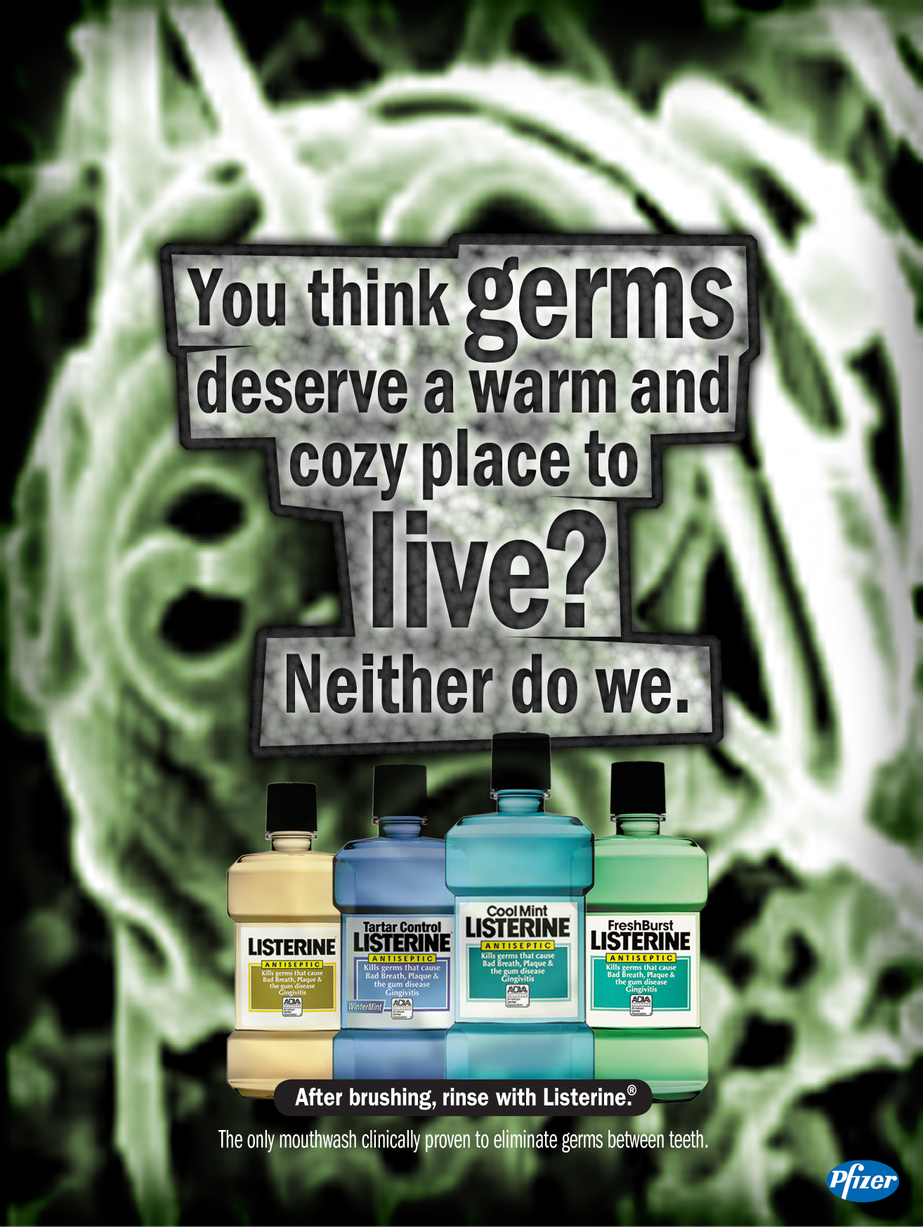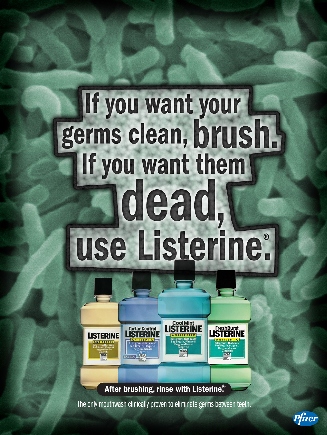 The headlines seek to portray germs as slimy scoundrels who’s time has come thanks to Listerine.