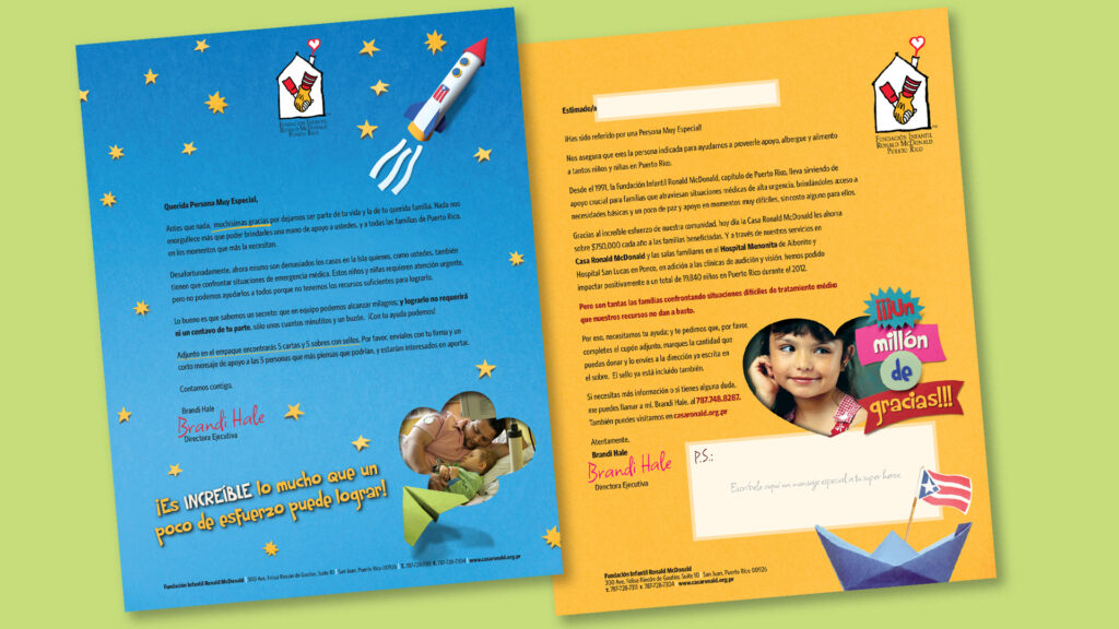 This direct mail piece makes a strong appeal to potential donors by making it seem like an imaginative child is connecting directly to the potential donor, not the silly adults in charge.
