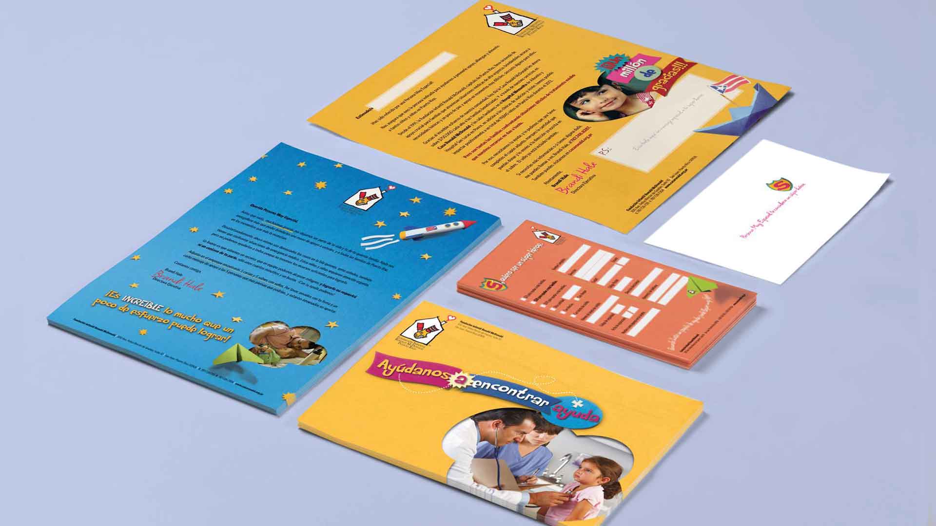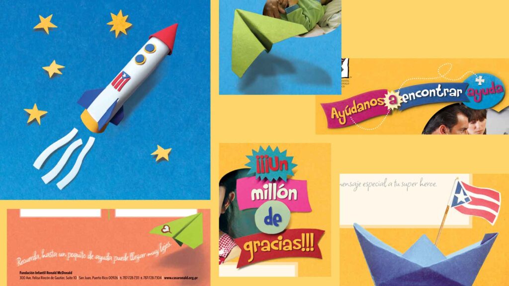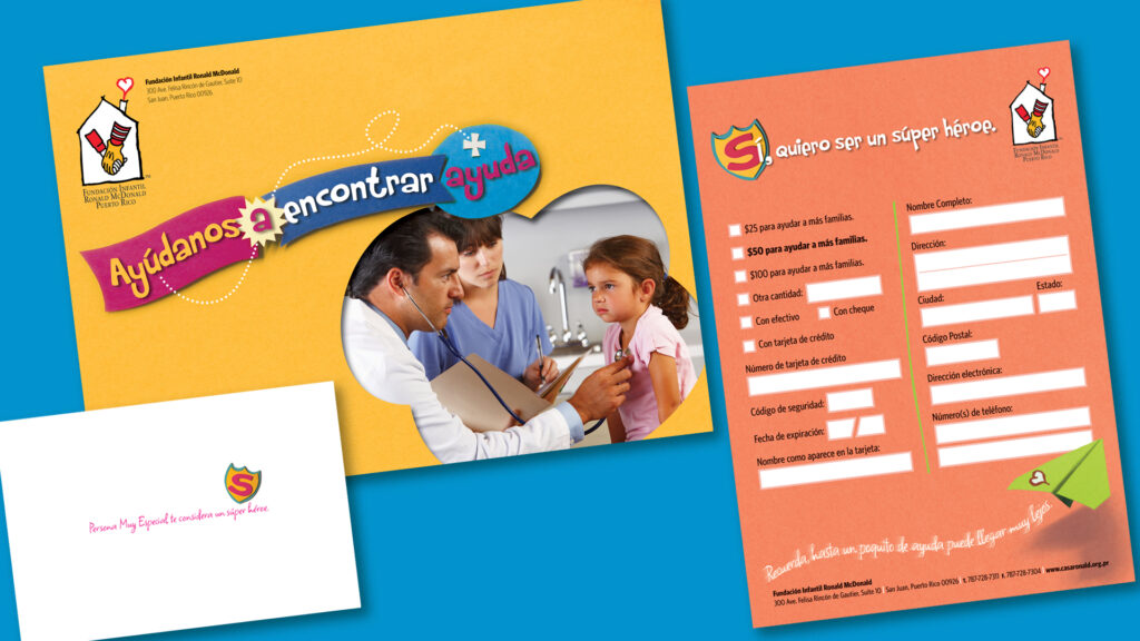 I designed several direct mail pieces for fund raising including this mailer where I crafted several cut out construction paper compositions of space ships, boats and paper airplanes to portray the donor as an action super hero.